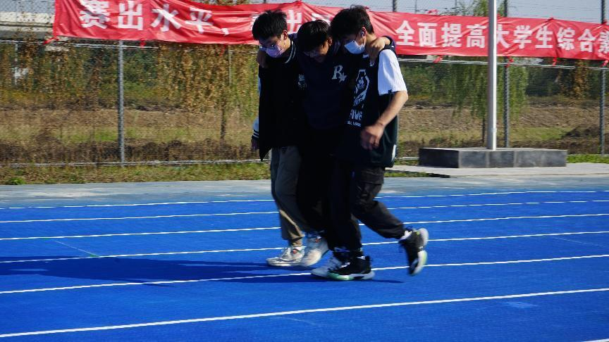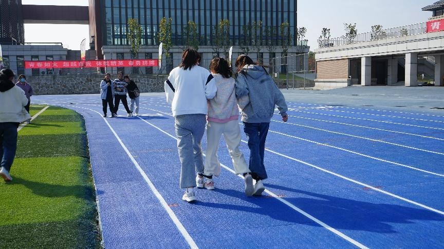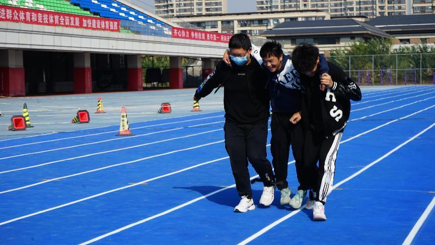 三人四足的赛道上“一二一二”整齐的口号此起彼伏,同学们的游戏姿势千奇百怪,让人忍俊不禁。
