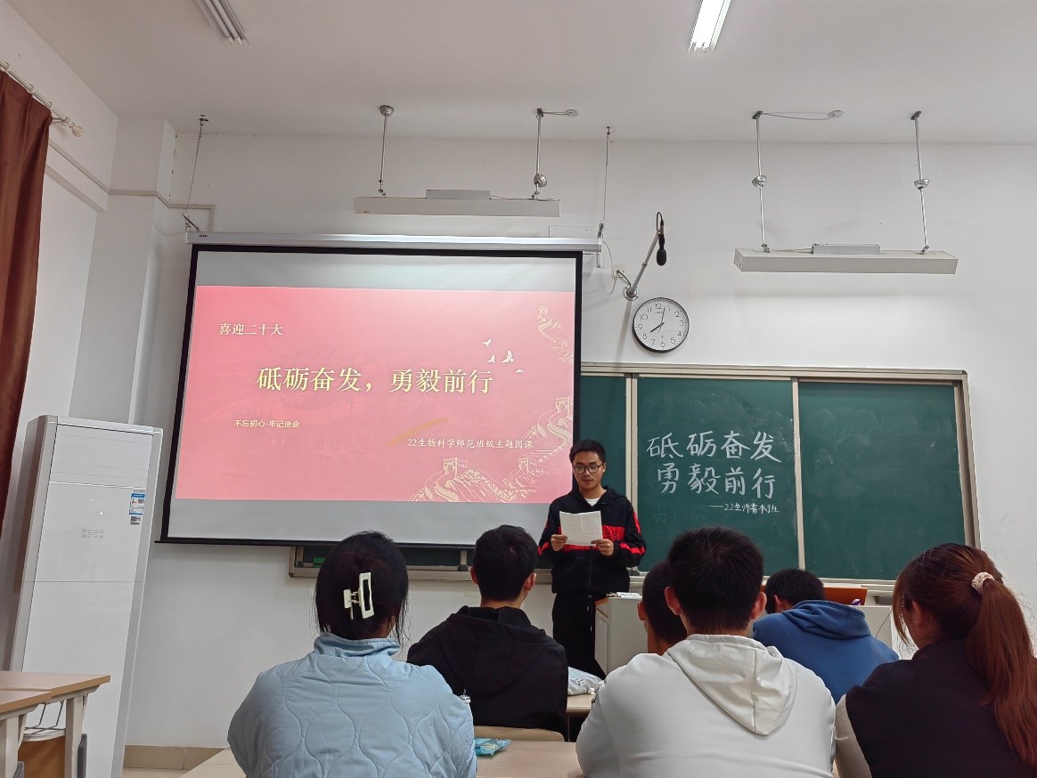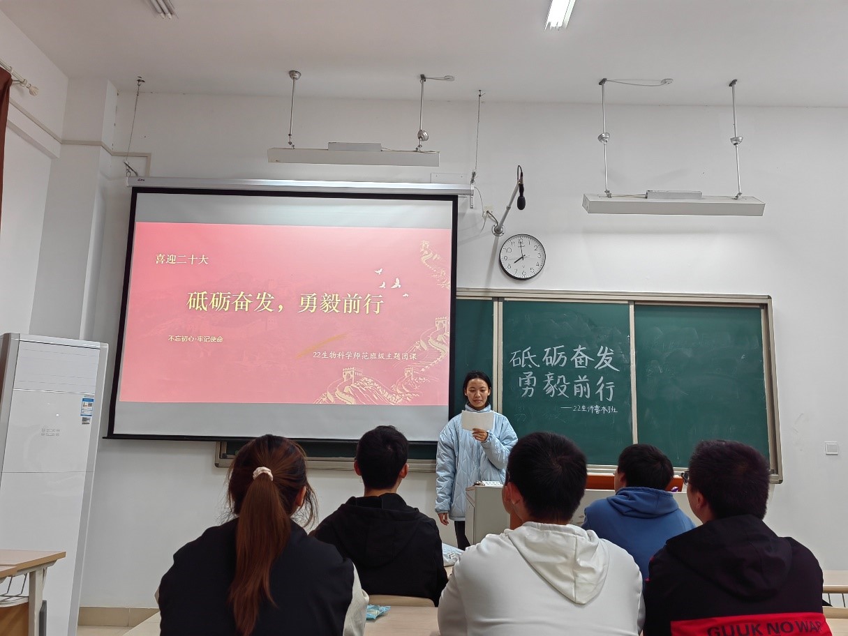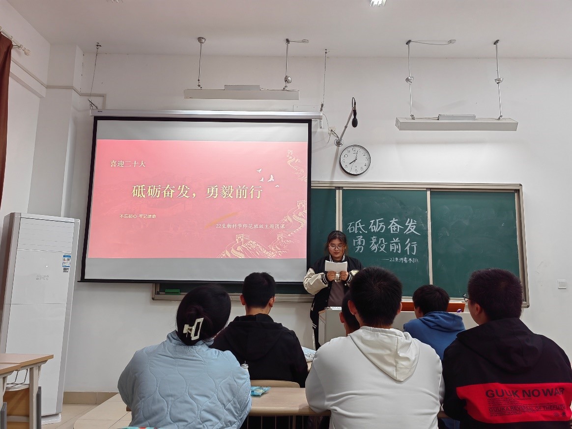 党的二十大是中国共产党在百年辉煌成就和十年伟大变革的高起点上创造新时代更大荣光的大会,它担负着全党的重托和人民的期待,不仅对中国产生深远影响,也为世界各国携手应对挑战、实现共同发展注入动力。为了让青年学生深刻了解二十大精神,22生师普本团支部组织开展“砥砺奋发,勇毅前行”的主题团课,以下是三位共青团员学习本次主题团课后的思考与感悟。