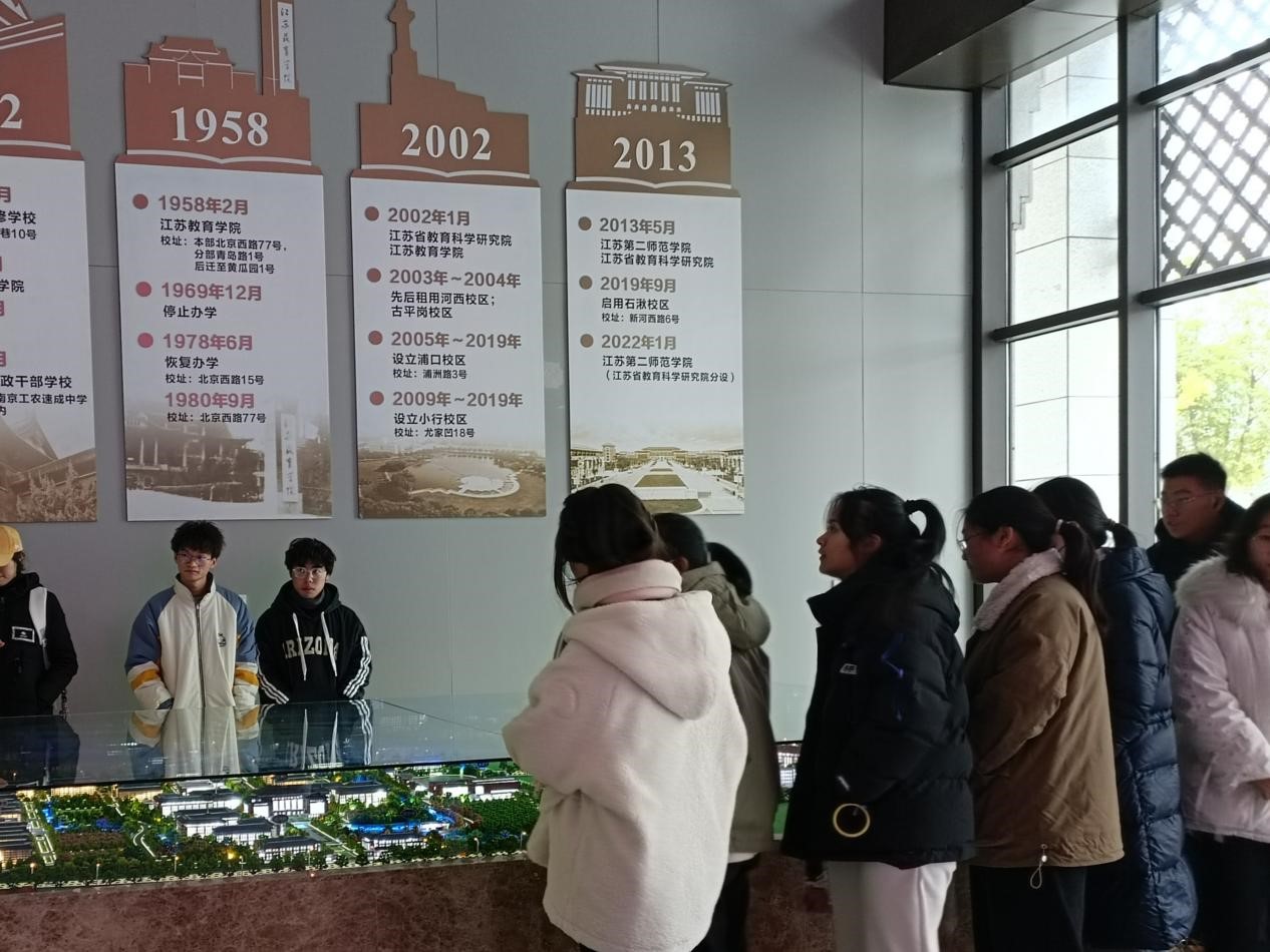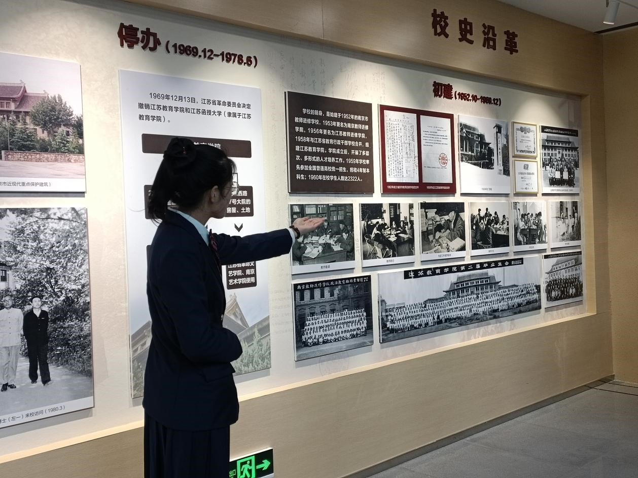随后,同学们随讲解员走进校史长廊。通过讲解员的介绍,同学们了解到学校曲折、向上的发展历程。为适应江苏基础教育发展的需要,学校始终坚持多层次、多形式、多规格的办学思路,坚持职业培养和职后培训相结合、学历教育和非学历教育并举,提升了全省中小学教师队伍的整体水平。