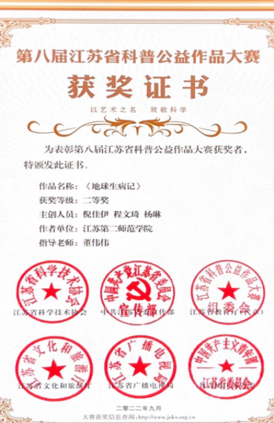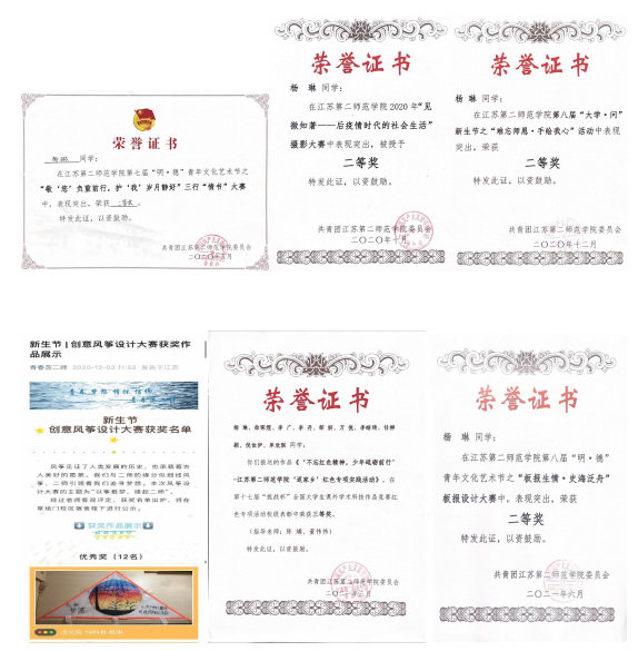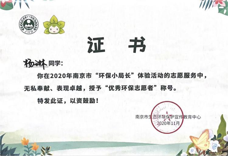 这一年,她带领社员参与各种志愿服务,鼓励社员参加比赛,社团三位成员在江苏省大学生环保知识竞赛中获一等奖与优秀组织称号;社团项目成功入选国家生态环境部宣教中心的资助项目1项,入选全国大学生科技志愿服务示范团队1项。