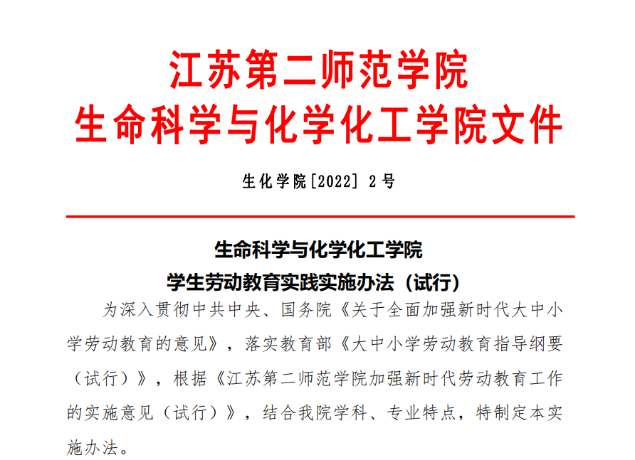 生化学院高度重视劳动教育,结合我院学科、专业特点,制定《生命科学与化学化工学院学生劳动教育实践实施办法(试行)》,形成形式多样、内容丰富的学生劳动实践项目清单,着重在学生日常生活、公益志愿服务等方面进行劳动教育实践。同时,结合学院专业特色,开发学院特色劳动教育项目,创新劳动教育内容、途径、方式,增强劳动教育时代性,推动劳动教育有机融入到学生综合素质培养全过程。