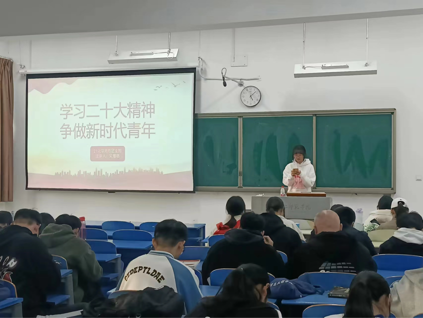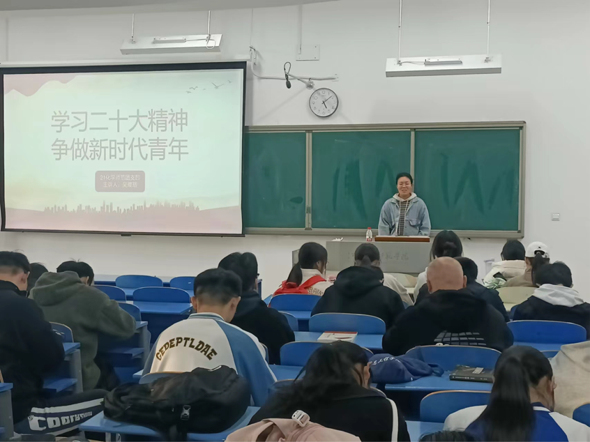 党的二十大是在全党全国各族人民迈上全面建设社会主义现代化国家新征程、向第二个百年奋斗目标进军的关键时刻召开的一次十分重要的大会,为深入贯彻学习党的二十大精神,将全团思想和行动统一到党的二十大精神上来,21化师团支部组织开展以“学习二十大精神 争做新时代青年”为主题的团课活动。下面是三位共青团员对本次团课的思考与感悟。