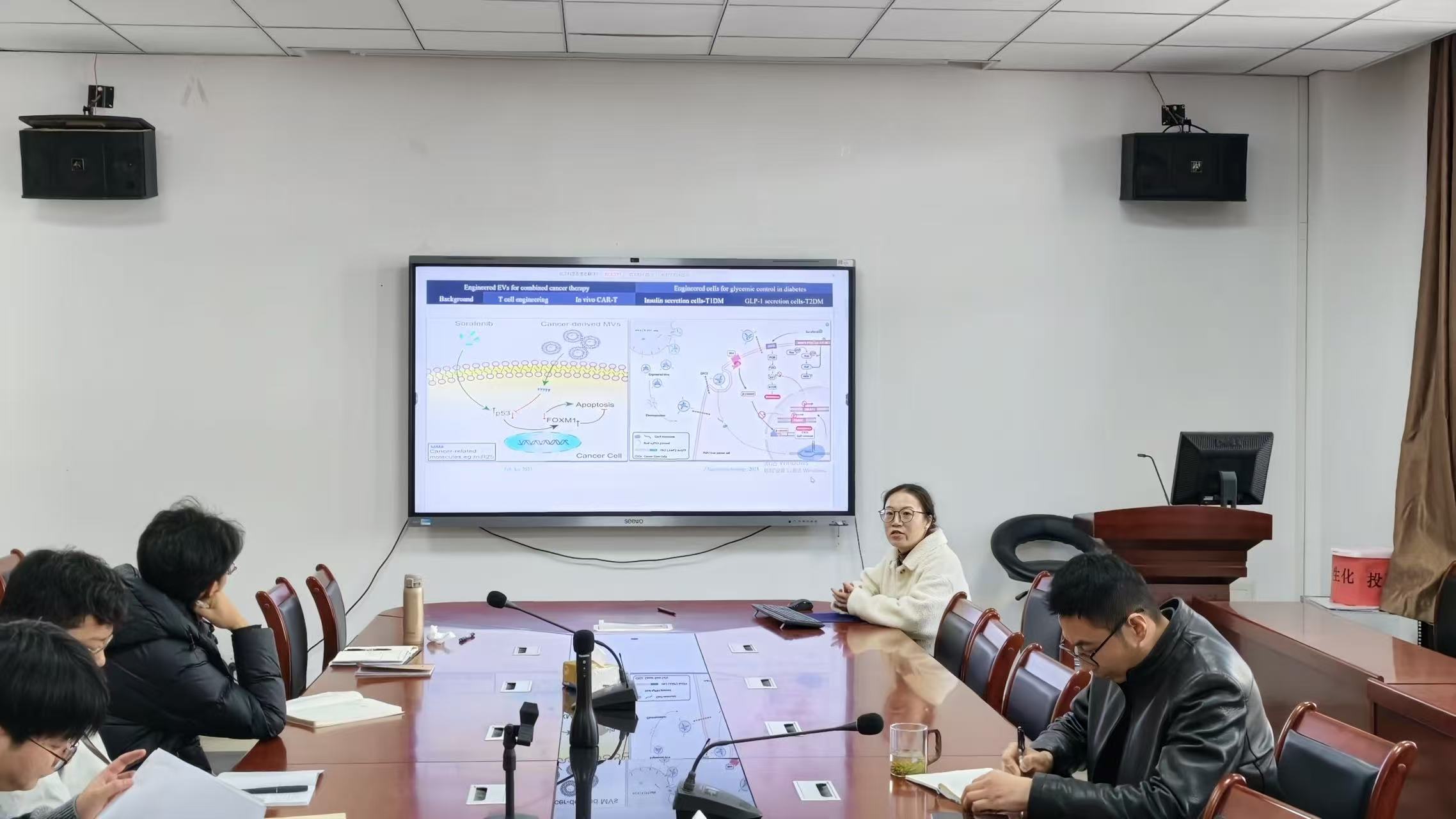 何聪老师系统汇报了其在"工程化细胞与胞外囊泡在疾病治疗中的应用"方面的系列研究成果。在肿瘤治疗方向,团队致力于工程化胞外囊泡(EVs)的开发,通过CRISPR/Cas9基因编辑技术,实现对肿瘤浸润淋巴细胞(TILs)中PD-1/DUSP2的特异性阻断,显著增强抗肿瘤免疫应答,获得江苏省高校面上项目支持。同时,团队还构建了用于T细胞在体编辑(in vivo CAR-T)的工程化囊泡。在糖尿病治疗方向,团队构建了可响应血糖变化的胰岛素分泌工程细胞,并在动物模型中验证了其持续改善高血糖的效果。此外,团队还深入探讨了高糖环境下FGF2-IRES翻译调控机制及PKCζ/hnRNPA1信号通路的作用,为工程细胞的功能优化提供了新思路。
