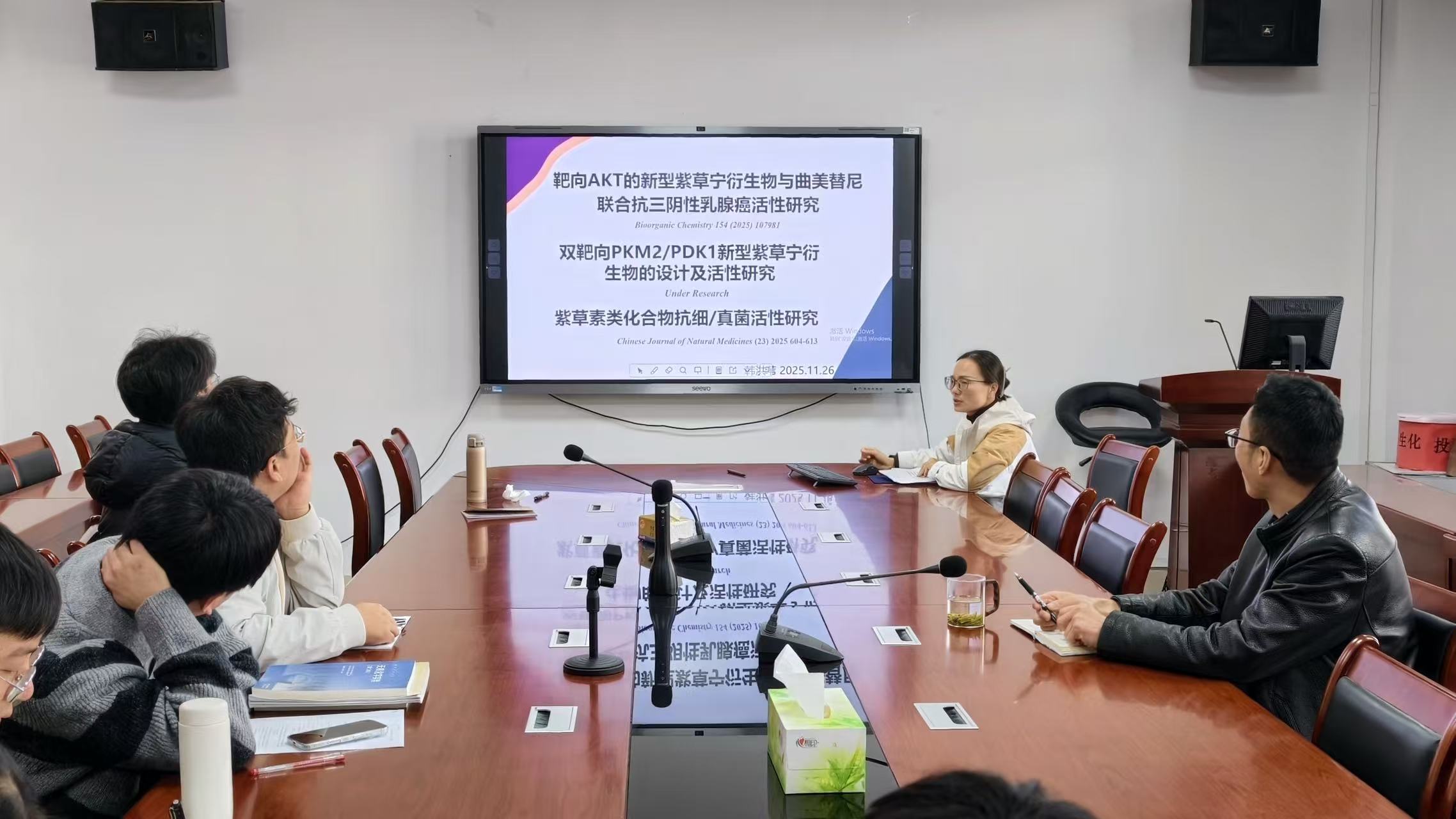 活动中,韩洪苇老师与何聪老师分别就各自研究领域的最新进展作了专题报告。青年教师韩洪苇的报告围绕紫草宁衍生物的抗三阴性乳腺癌活性及抗微生物活性等核心议题展开。报告中,韩洪苇老师系统介绍了三项重点科研工作。在抗肿瘤研究方面,她首先以《靶向AKT的新型紫草宁衍生物与曲美替尼联合抗三阴性乳腺癌活性研究》为题,汇报了设计合成的一系列新型紫草宁衍生物。该研究不仅证实了目标化合物可作为有效的AKT抑制剂,还将其与现有临床药物曲美替尼联用,展现出卓越的协同抗肿瘤效果,为攻克预后极差的三阴性乳腺癌提供了极具潜力的联合用药新策略。随后,在《双靶向PKM2/PDK1新型紫草宁衍生物的设计及活性研究》报告中,韩洪苇老师分享了团队在药物设计理念上的又一突破。通过精巧的结构修饰,他们成功获得了能够同时靶向肿瘤能量代谢中的两个关键蛋白—PKM2和PDK1的双靶点抑制剂。这种“一石二鸟”的设计策略,有望克服单靶点药物易产生耐药性的瓶颈。除了抗肿瘤研究,还在《紫草素类化合物抗细/真菌活性研究》中,展示了紫草素类化合物在抗细菌和抗真菌方面的广阔应用前景。该研究为开发基于天然产物结构的新型抗菌药物奠定了坚实的理论基础。