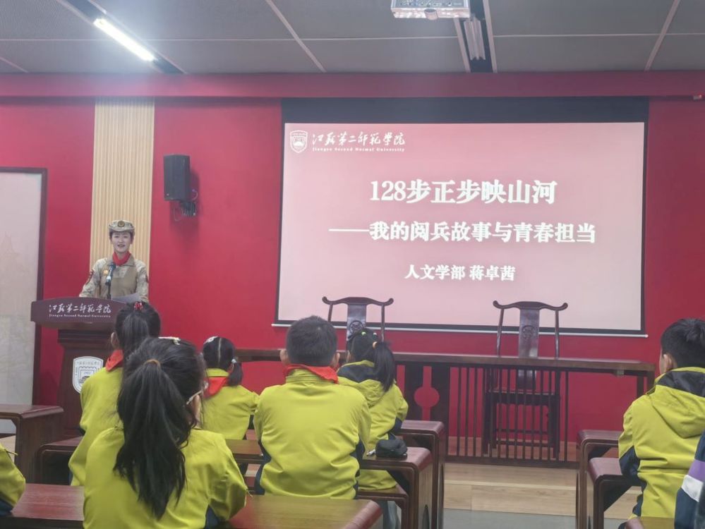 在“立报国志、扬爱国情、践强国行” 活动阶段,特别邀请了陆军工程大学“红色薪火”强军故事宣讲团同学开展精彩宣讲。姜欣雨同学以《你守护蓝天,我们守护你》为题,分享了父辈的军旅故事,如今她也身着军装传承爱国奉献精神,让红色薪火代代相传。黄静蕾同学带来《着父辈之履 筑吾军旅梦》的深情讲述,以父亲的“军靴”为线索,串联起父亲从南疆戍边、维和战场的坚守足迹。如今她也坚定选择从军报国,生动诠释了责任与传承的真谛。我校学生蒋卓茜以《128步正步映山河——我的阅兵故事与青春担当》分享了自己的成长感悟。她曾入伍中国人民解放军仪仗司礼大队,参与9·3胜利日阅兵,在长安街上走出128步庄严正步,用青春践行“为祖国担当”的誓言。三场宣讲情真意切、催人奋进,让在场师生深受触动,深刻体悟到家国情怀与青春担当的深刻内涵。
