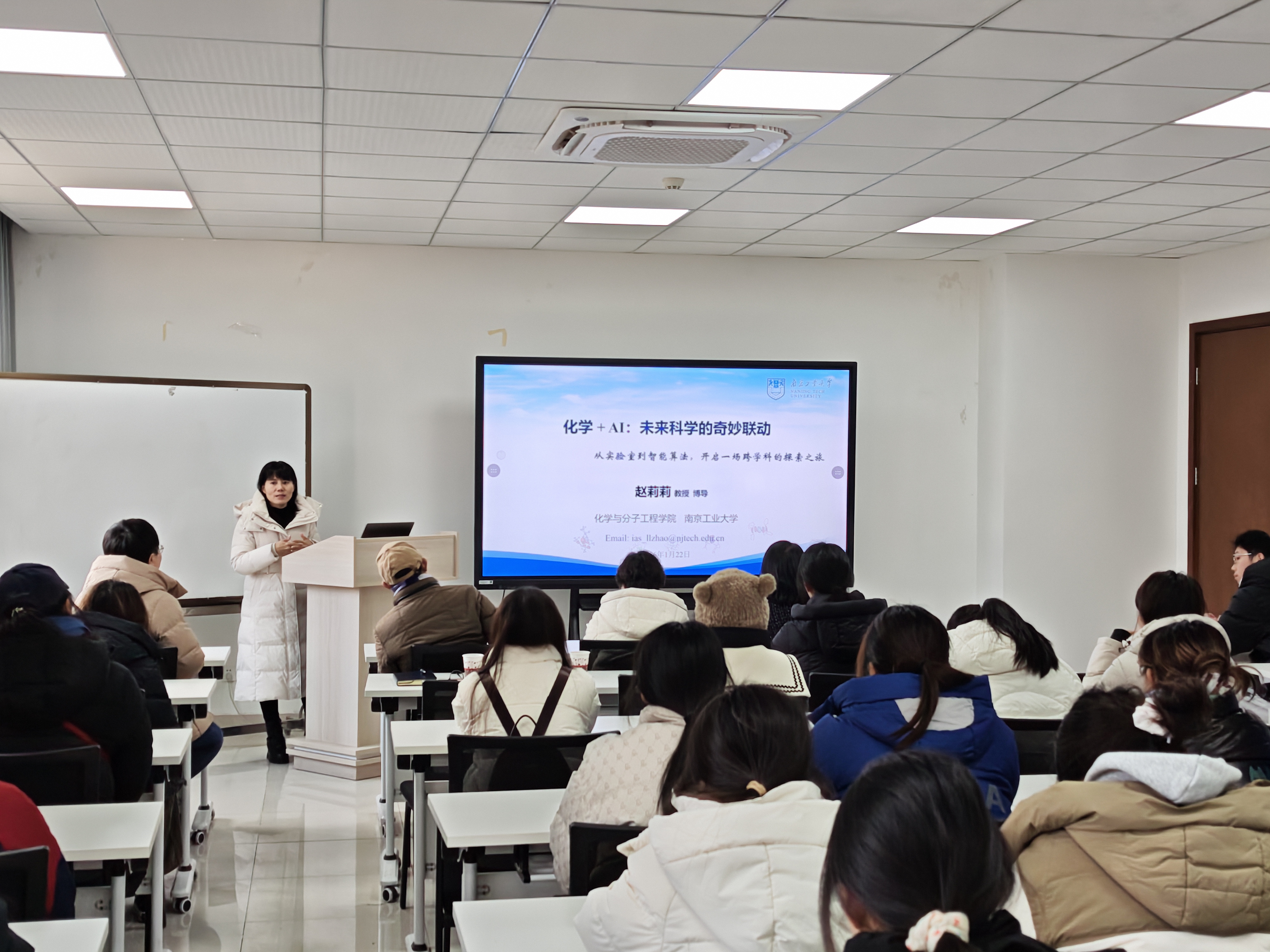 随后,化分学院优秀青年教师代表、省杰出青年基金获得者赵莉莉教授为同学们带来了一场题为“化学+AI:未来科学的奇妙联动”的科普讲座。赵教授深入浅出地阐述了人工智能技术如何深刻变革传统化学研究范式,驱动计算化学快速发展,并在新材料设计、反应机理探索、实验方案优化等方面发挥关键作用。她结合自身科研经历,鼓励同学们主动拥抱技术变革,夯实专业基础,积极学习交叉学科的新知识、新方法,勇于迎接未来科学挑战。